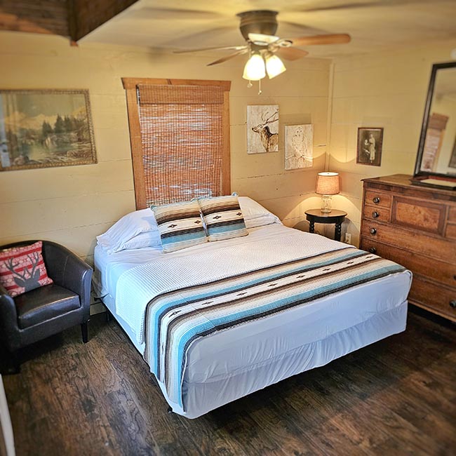 Pinecone Cabin The Pinecone Cabin RESERVE ONLINE NOW Pinecone Cabin– sleeps 2 – 4 guests (can sleep 6 with air-mattress provided by guests for kids only) 2 bedroom (King and queen bed); full kitchen; living room; 2 baths (shower/tub combo and shower); private hot tub.